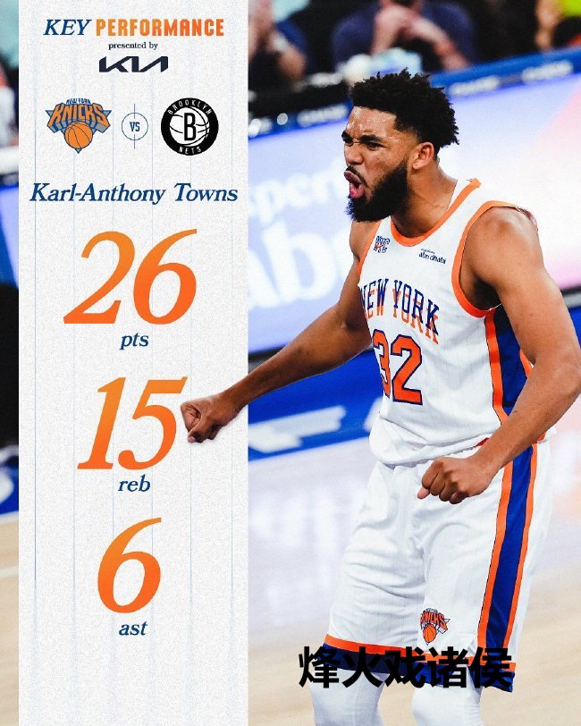 尼克斯(7-6):唐斯26分15篮板6助攻、阿努诺比24分8篮板、布里奇斯21分6篮板、哈特20分8篮板8助攻、布伦森12分5篮板10助攻